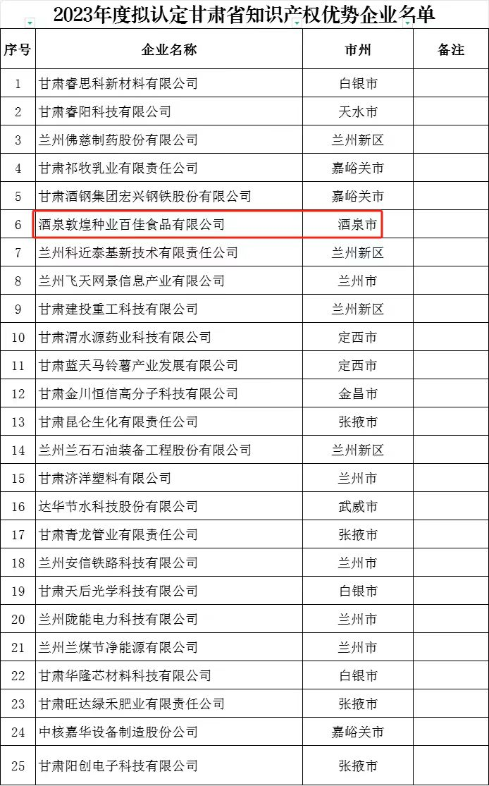 喜訊傳來!酒泉敦煌種業百佳食品有限公司榮獲“甘肅省知識產權優勢企業”稱號